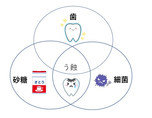 歯、最近(う蝕原因菌)、佐藤の輪が重な田時に発生する事を説明しています。